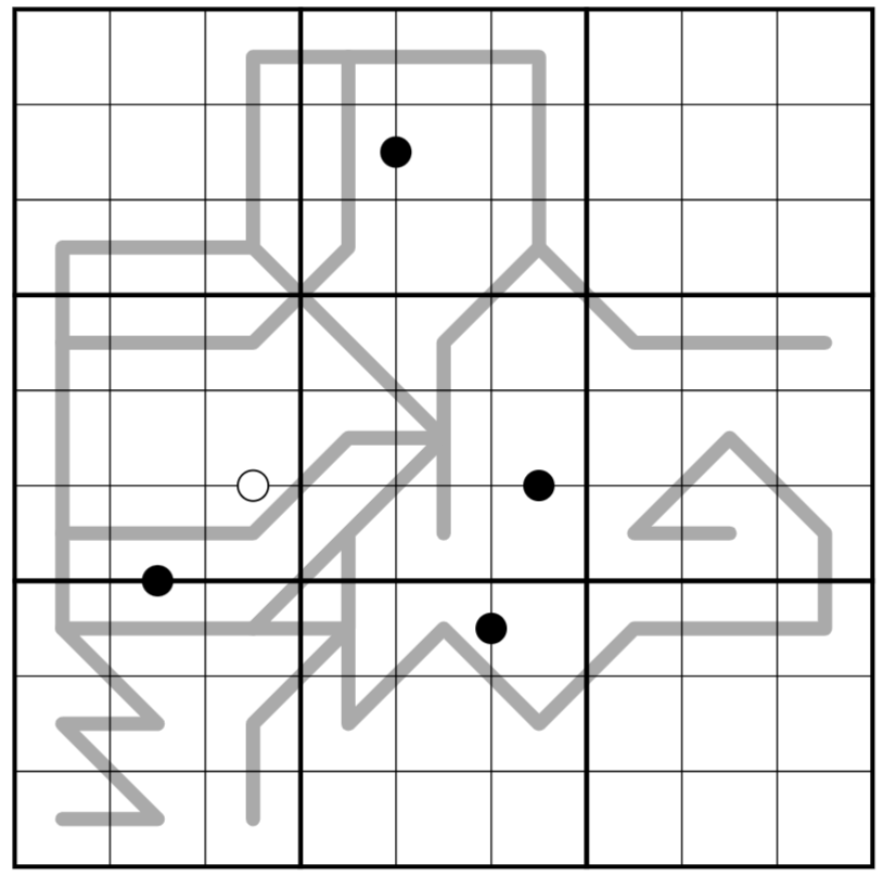 • Polyline: Box borders divide the gray line into segments, each of which must be a valid chess line for one and only one of the following types: Bishop, Knight, Rook, or King. Segments that are directly connected may not be the same type.