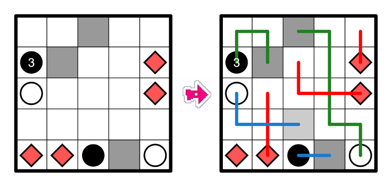 - No shape's path can intersect another path of a similar shape (including its own). Black circles' paths cannot intersect with any other path. However, white circles' paths may intersect the paths of red diamonds. Both shapes must go straight at each such intersection (an intersection cannot be at the start or endpoint of either shape's path).