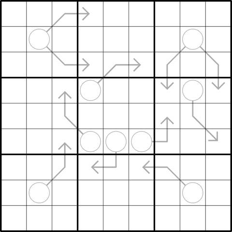 Normal sudoku rules apply. Digits on an arrow sum to the digit in the attached circle.