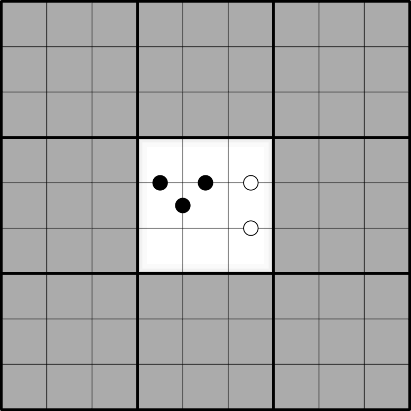 White dots join cells with consecutive digits; black dots join cells with a 1:2 ratio. Not all dots are given.
