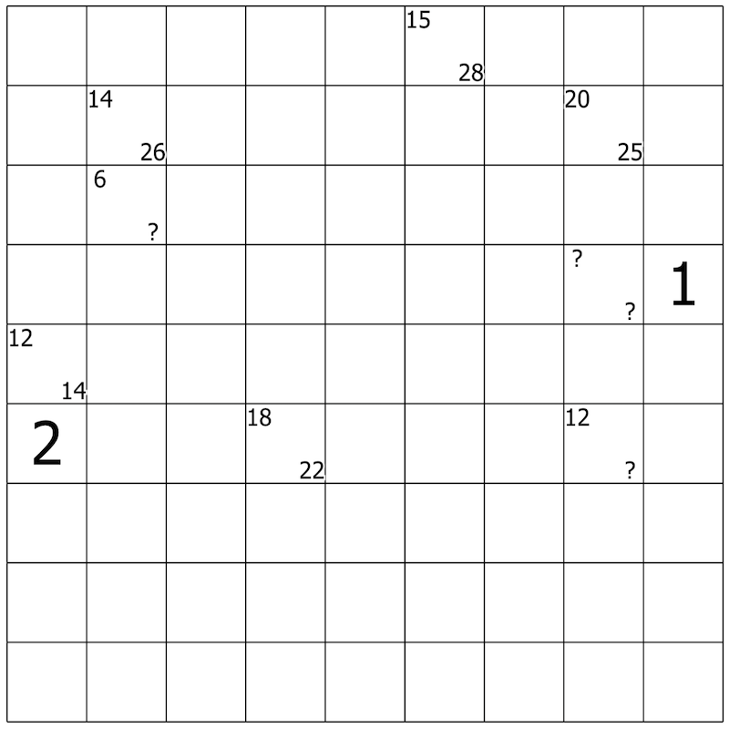 A clue cell gives the position of the leftmost cell in the topmost row of a region, and contains 2 numbers. One number gives the sum of the digits in that region's 2x2 hub, and the other number gives the highest sum of any of that region's appendages. These numbers are given in an unspecified order. A '?' can stand for any positive integer.