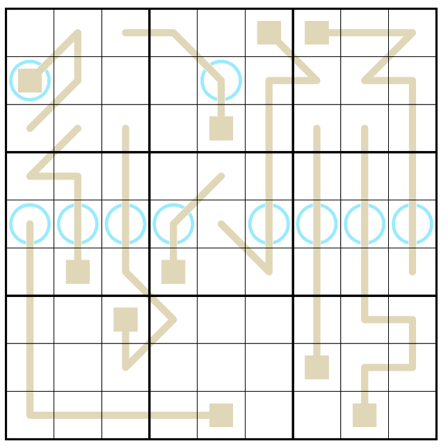 Digits may not repeat on a beige hitline. A circled digit on a hitline indicates how many digits match their position number along that line, starting at the end with the square (which is 'position 1'.)