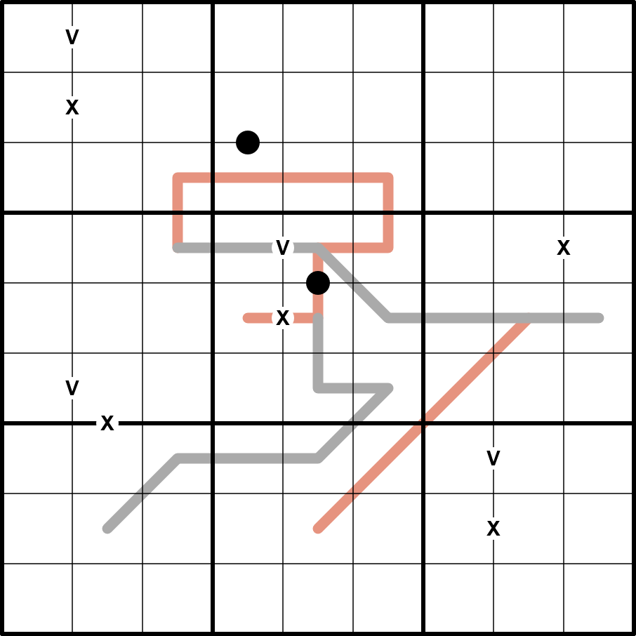 - Dutch Whispers - digits along a dark pink/salmon-colored Dutch Whisper line must differ in value from their neighbors on the line by at least 4.