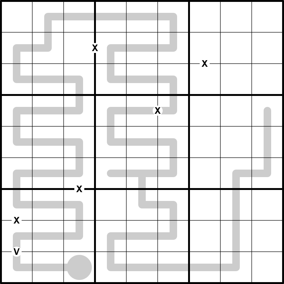 XV: Cells connected by an X must sum to 10. Cells connected by an V must sum to 5.