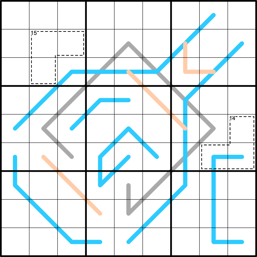 Entropic lines: Any set of three sequential cells along an peach entropic line must contain a low digit (123), a middle digit (456), and a high digit (789).
