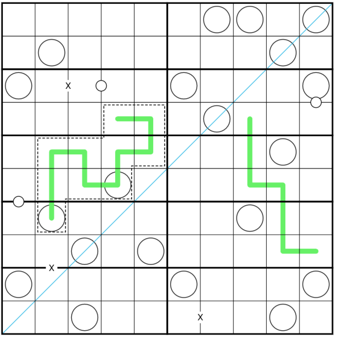 Digits in a cage, or along the thin blue line dividing the grid diagonally, do not repeat.