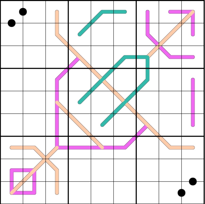 Every set of three sequential cells on a teal modular line must contain one digit from (1,4,7), one digit from (2,5,8), and one digits from (3,6,9).