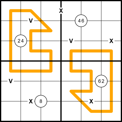 XV Pairs: Cells separated by an 'X' must sum to 10. Cells separated by a 'V' must sum to 5.
