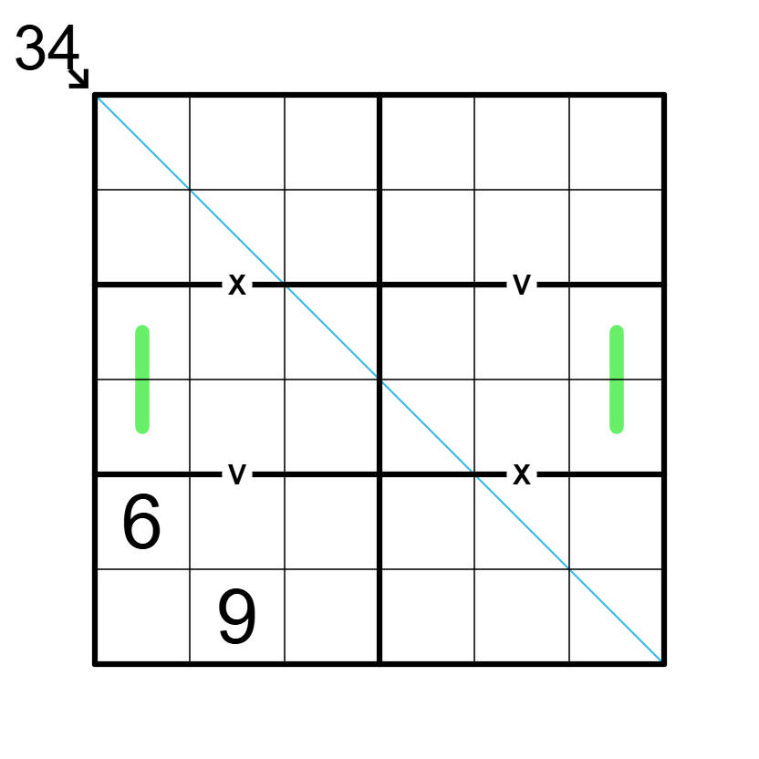 - The negative diagonal (marked in blue) sums to 34 and has no repeat numbers