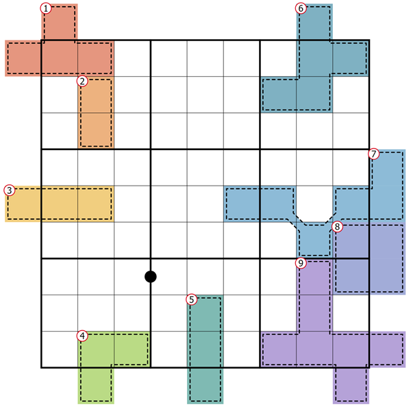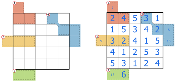 - Digits are from the 1-9 range only, no zero can appear anywhere in the puzzle (i.e. 10 is not a valid sum for an X-Sums)