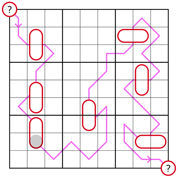 - Numbers in cages sum to the corresponding red values from the previous puzzle (numbered along the path, from top left to bottom right)