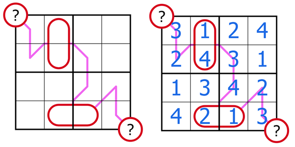 - Paths between red values are also Renban lines (cells within red pills do not count towards Renban lines). Digits on a Renban line form a set of non-repeating, consecutive digits in any order