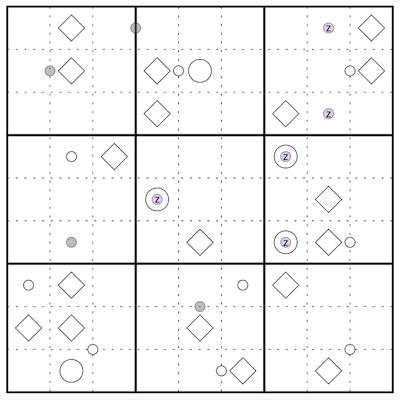 Lilac dots (containing a "z") mark "Zipper" galaxies where rotationally symmetric pairs of digits sum to the value of the center digit. Grey dots mark "renban" galaxies whose digits form an unbroken consecutive sequence in any order. White dots mark galaxies whose digits do NOT form a sequence. Digits may not repeat within a galaxy.