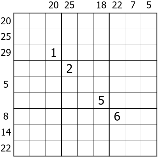 Clues outside the grid indicate the sum of the digit(s) placed between the digit 1 and the digit 9 in the corresponding row or column.