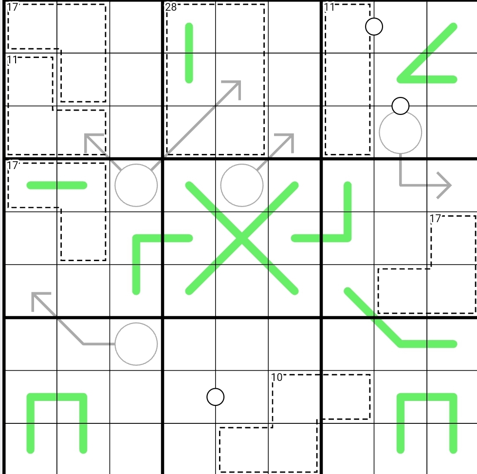 4. Digits in dashed cages sum to the value in the top left corner. Digits do not repeat in boxes.