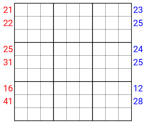 Y-Sums: Blue clues outside the grid indicate the sum of the first Y digits in the corresponding direction. Y is the digit placed in the Xth cell in the corresponding direction, where X is the digit placed in the first cell in that direction.