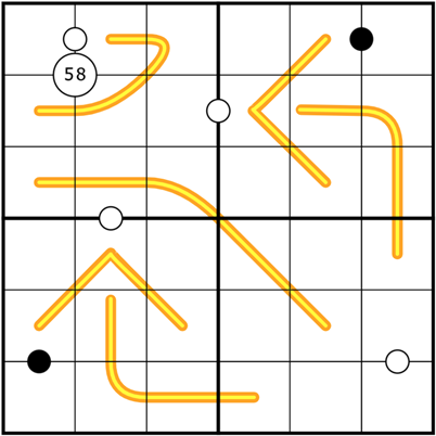 Dutch/Nabner Lines: Any two cells along an orange or yellow line must differ by at least 4. Digits also cannot be consecutive with any other digits on the line and may not repeat.