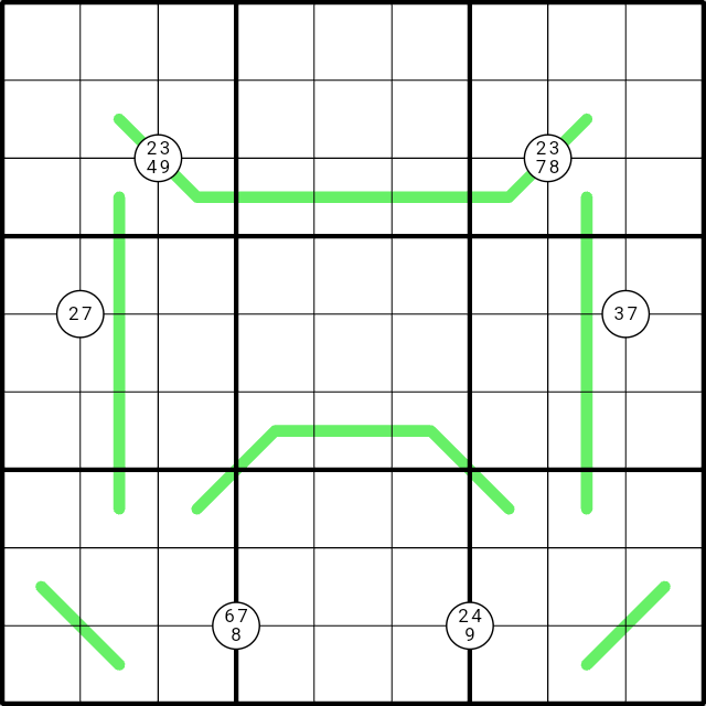 German Whisper - Adjacent digits on a green line must differ by 5 or more.