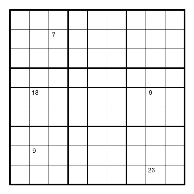 -(clues) A number in the upper left corner of a cell indicates the size of the (maximal) orthogonally connected region within one group of cells the clued cell belongs to, "?" can mean any (single) digit.