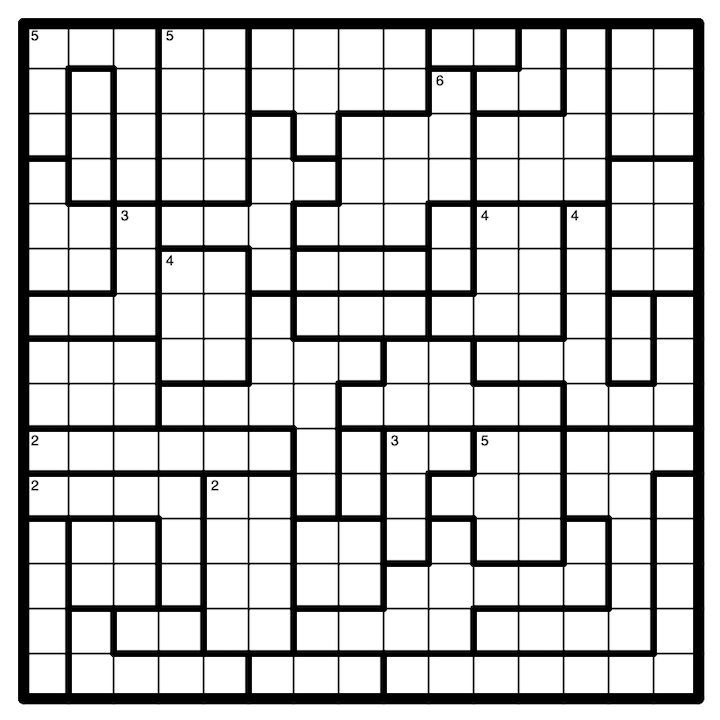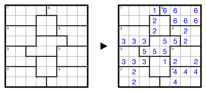 Within a room, all numbers must be the same, and the number placed is equal to the count of numbers in that room. A clue in the top-left corner of a room, if given, indicates the amount of numbers in that room (or equivalently, the number to be placed in that room). Every room contains at least one number.