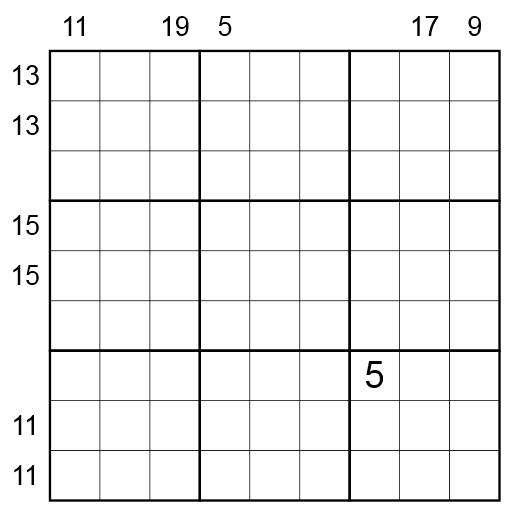- Up to N-sums: A clue outside the Row or Column N indicates the sum of all digits up to the cell that contains the digit N. (The digit N itself is not included in the sum.)