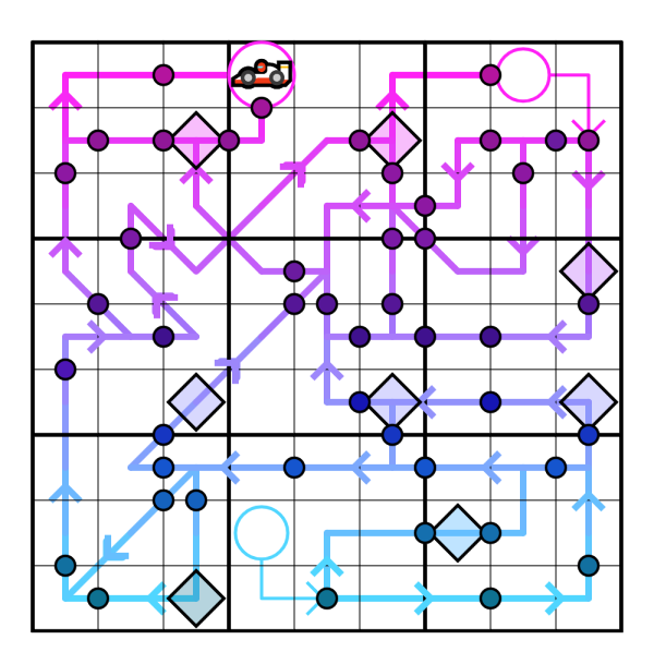 Path: You must start from the Blue Arrow, and connect it to the Pink Arrow by exclusively going through past segments on the grid. After reuniting the arrows, you must reach the DeLorean (car emoji) by exclusively traversing future segments. Your path can't go against the indicated direction of travel, and can't visit the same cell twice.