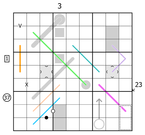 Entropic Lines: Any set of three sequential cells along a beige line must contain a low digit (1,2,3), a middle digit (4,5,6), and a high digit (7,8,9).
