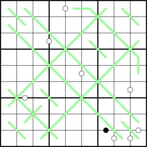 Normal Sudoku rules apply. GERMAN WHISPERS(+)- Numbers on green lines are EXACTLY 5 apart from their neighbors on the line. KROPKI PAIRS- Numbers with a white dot between them are consecutive. Numbers with a black dot between them are in a ratio of 2:1. Not all possible dots are given.