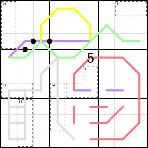 (Beatles, 1969) "Here comes the sun. Here comes the sun, and I say it's alright." Normal Sudoku rules apply. German Whispers (mountains)- Numbers on the green line are at least 5 apart from their neighbors on the line. RENBAN (horizon and person's eyes)- Numbers on purple lines are each a set of non-repeating, consecutive numbers, in any order. DUTCH WHISPERS(+)- Numbers on RED (head, nose and mouth) AND YELLOW (sun) lines are at least 4 apart from their neighbors on the line. The only digit 5 on the RED, YELLOW or GRAY (thumbs up) lines is given. KROPKI PAIRS- Numbers with a black dot between them are in a ratio of 2:1. Not all possible dots are given. KILLER CAGES- Numbers in cages sum to the number in the top left corner of the cage.