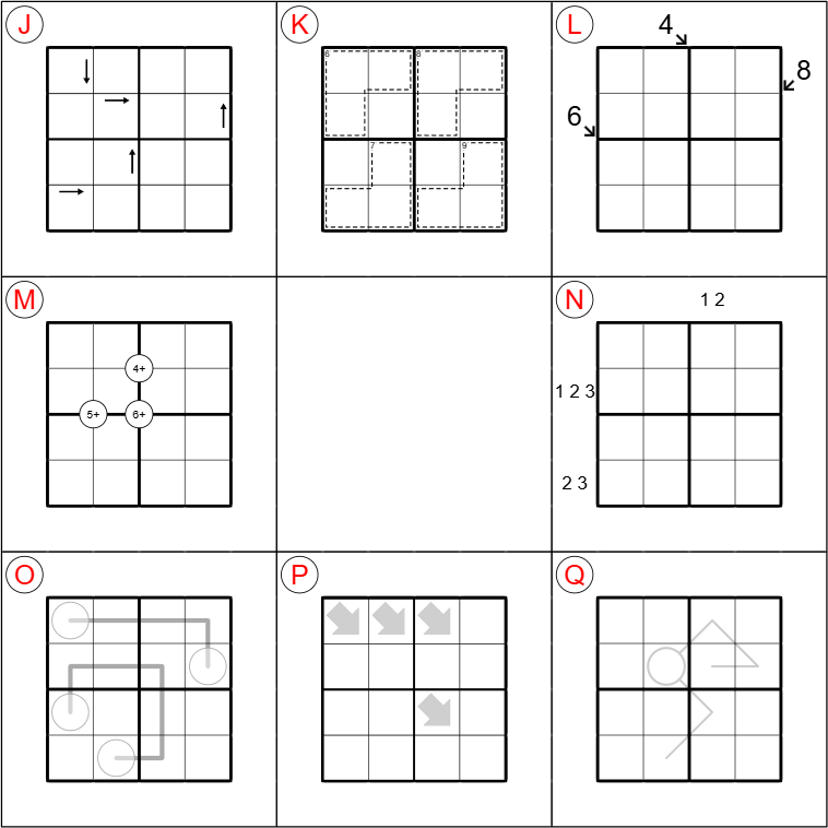 Point to Next: If a digit N is placed in a cell containing an arrow, then the digit N+1 must be placed somewhere in the direction that the arrow points (not necessarily right next to the arrow).