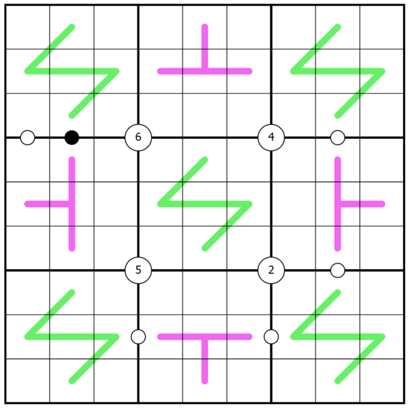 - Digits on a pink line form a set of consecutive non repeated digits in any order. For example 37465 is a valid length 5 line