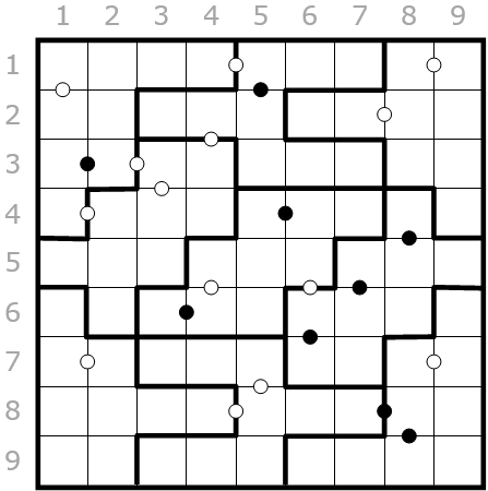 All adjacent cells that contain digits with a difference or a sum equal to the index number of the column or row are marked with a white dot (difference) or a black dot (sum).