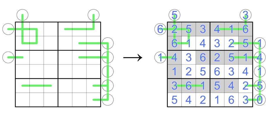Circles: The digit in a circle must equal the length of the first run of shaded cells seen along the adjacent row or column. If no shaded cells appear the length is equal to 0. Circles themselves are not part of the Yin-Yang shading.