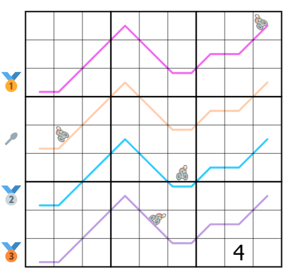 Finally, Digit in a cell with a rider indicates the amount of points earned by that rider.