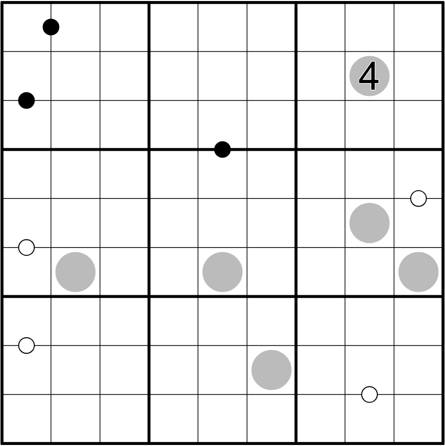 Digits separated by a black dot are in a 1:2 ratio; digits separated by a white dot are consecutive. Not all dots are given.