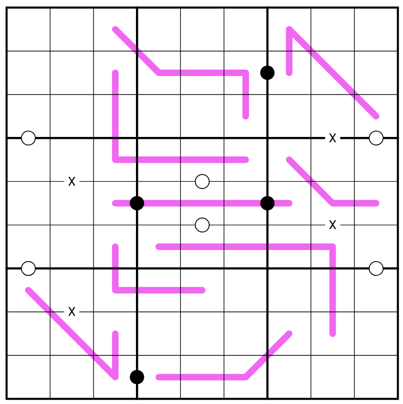 X-pairs. Cells separated by a "X" must sum to 10. Not all X-pairs are given.