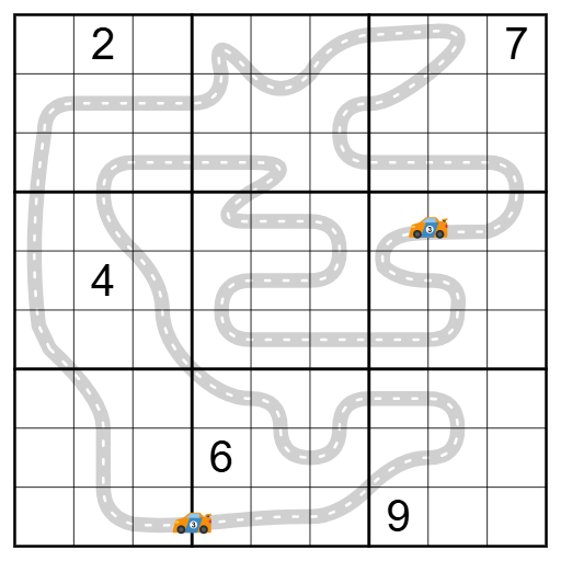 There are two racing cars on the track. The cells separated by the winning car contain digits in a 1:2 ratio. Cells separated by the other car contain consecutive digits.