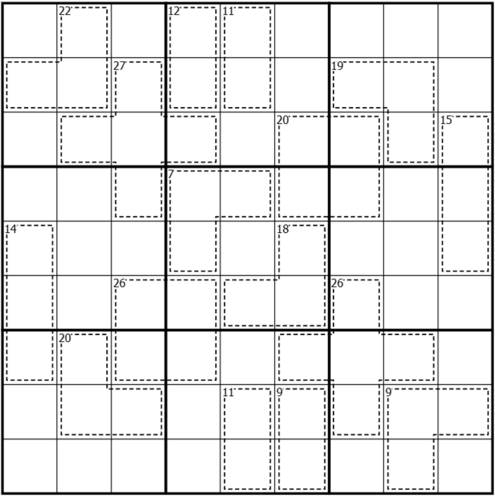 The small numbers in the upper left corner of each cage (dotted outlined region) indicate the sum of the digits in that cage. Within each cage all digits must be different. Each cage is either full of oil (even digits), full of water (odd digits), or a mix of both. Each row within a cage contains only one type of digits (oil or water). Oil floats on water, so even digits will always be in rows above odd digits in mixed cages.