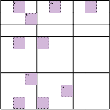 Normal Island rules: Each island also contains a set of non-repeating digits that sums to the lavender cell total if given. If no total is given, the sum is 6, 9 or 25. The number in the lavender cell is the number of cells in the island. Killer totals are not necessarily in the top left most cell of an island.