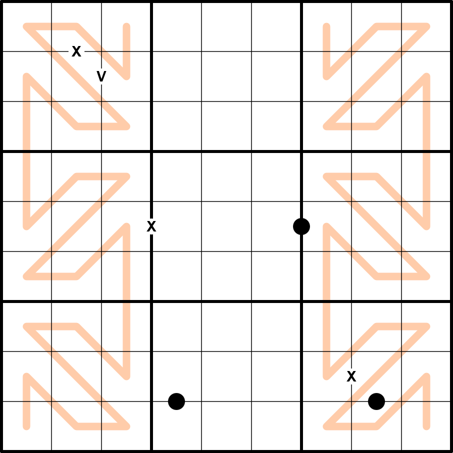 - Global modularity - every 2 by 2 box of cells must contain at least one digit from each of the following sets: (1,4,7), (2,5,8) and (3,6,9).