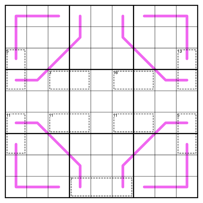 Cages: Digits in cages cannot repeat and must sum to the value shown in the upper left corner of the cage.