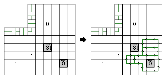 • Directed U-Bahn: draw a directed loop network through the centers of some (non-clue) cells, which may branch or turn, but may not have any dead ends. More precisely, every branch and cross in the grid is a sink or source (to be determined). All loop segments must be directed, connecting a source to a sink. A digit outside the grid indicates how many times the corresponding line shape (i.e. a cross, branch, straight line, or turn) appears in the corresponding row or column, irrespective of the line shape's rotation.