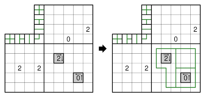 • Castle-Wall: clues inside the grid count the number of cell-edges crossed by the loop network in all indicated directions combined.