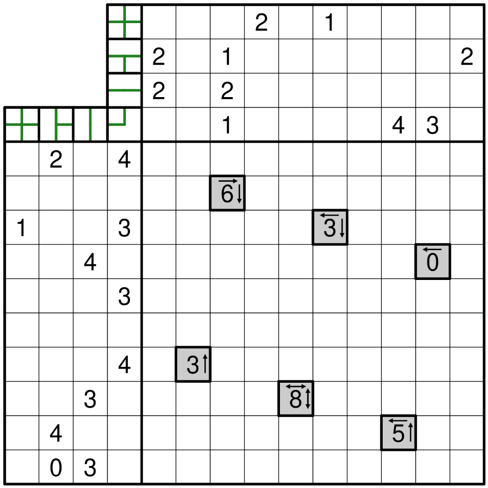 • U-Bahn: draw a loop network through the centers of some (non-clue) cells, which may branch or turn, but may not have any dead ends. A digit outside the grid indicates how many times the corresponding line shape (i.e. a cross, branch, straight line, or turn) appears in the corresponding row or column, irrespective of the line shape's rotation.
