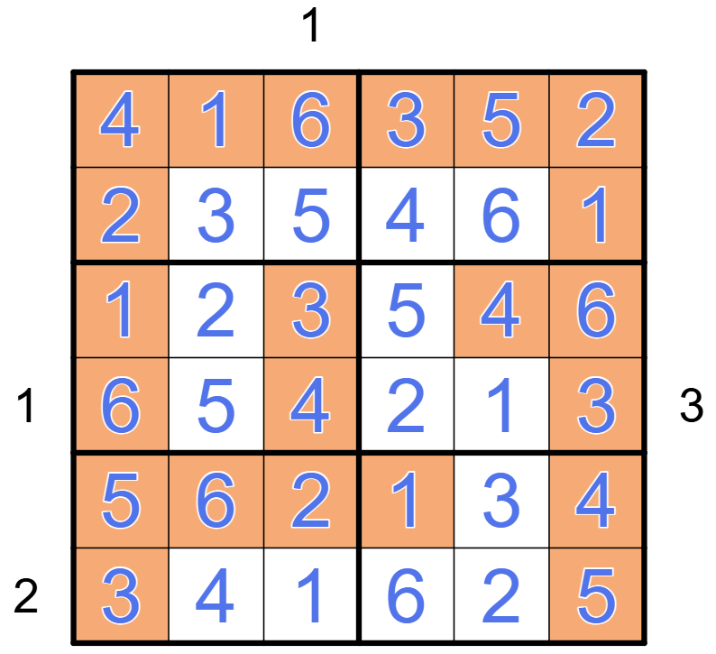 Dual Skyscrapers: Each digit in the grid represents the height of a skyscraper in that cell. Digits outside the grid simultaneously indicate the number of shaded skyscrapers and the number of unshaded skyscrapers that can be seen from the direction of the clue. Skyscrapers hide shorter ones of the same type (shaded/unshaded) but not ones of the other type.