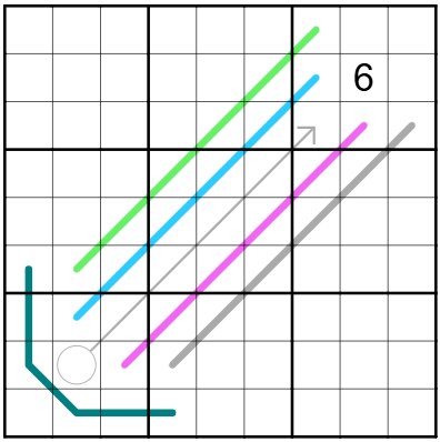 Normal sudoku rules apply. The gray line is a palindrome i.e. reads the same in both directions. Adjacent digits along the green line must differ by at least 5. Digits along an arrow must sum to the digit in that arrow's circle. Digits on a purple line form a set of consecutive integers in some order. Every run of three digits on the teal line contains a digit from {1,4,7}, a digit from {2,5,8} and a digit from {3,6,9}. Box borders divide the blue line into segments with the same sum.