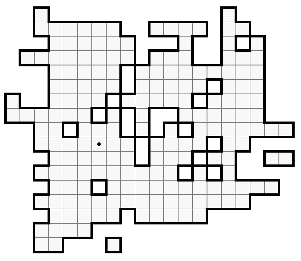 Starting at the black diamond, draw a directed path through the centers of some cells in the grid. Path segments are drawn sequentially from cell to cell, such that the first path segment is drawn from the black diamond to an adjacent empty cell, the second segment is drawn from that cell to the next empty cell, and so on until the final segment is drawn and the path ends.