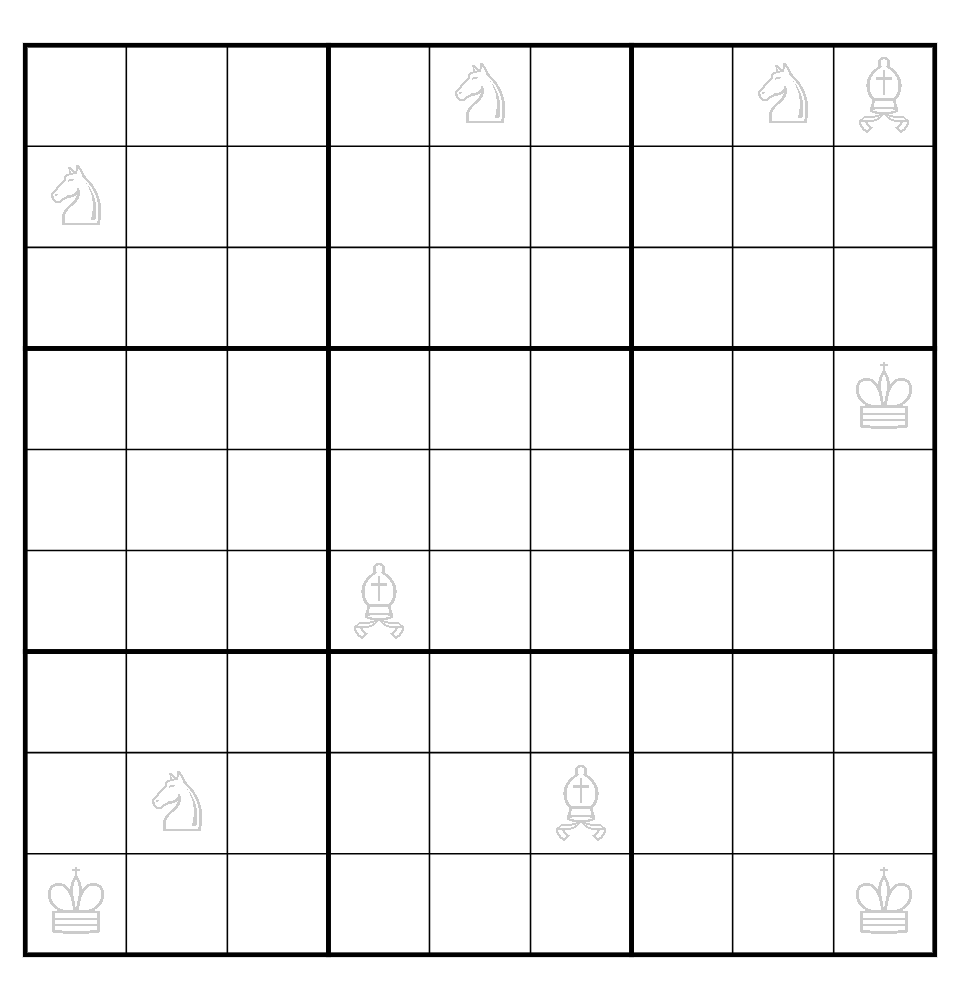CHESS SUMS - A digit on a chess piece is the sum of the digits in cells the chess piece could move to in a single move. Bishops and kings can only move to cells in the same 3x3 box, but knights can jump into other boxes.