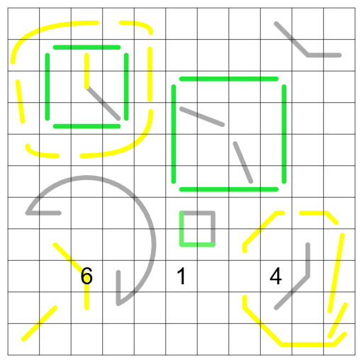 Palindromes: The sequence of values of cells along a grey line must be the same when read from either end.