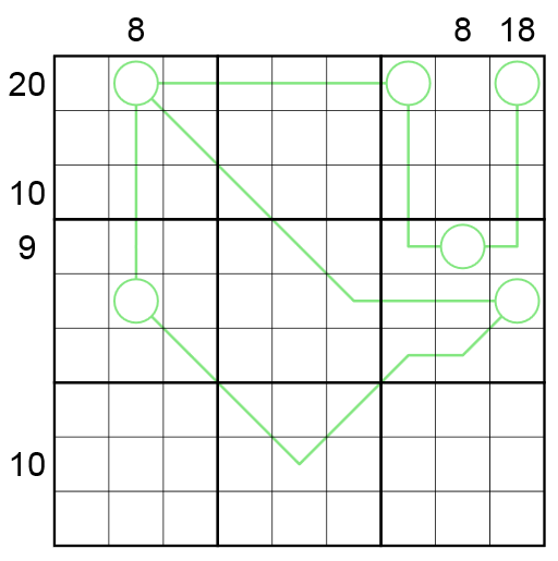 - Split Peas: Digits on a line between two circles sum to a two-digit number written using the digits in the circles. For example, 3_346_1 could be a valid split pea line, as 3+4+6=13, which is 1 concatenated with 3.